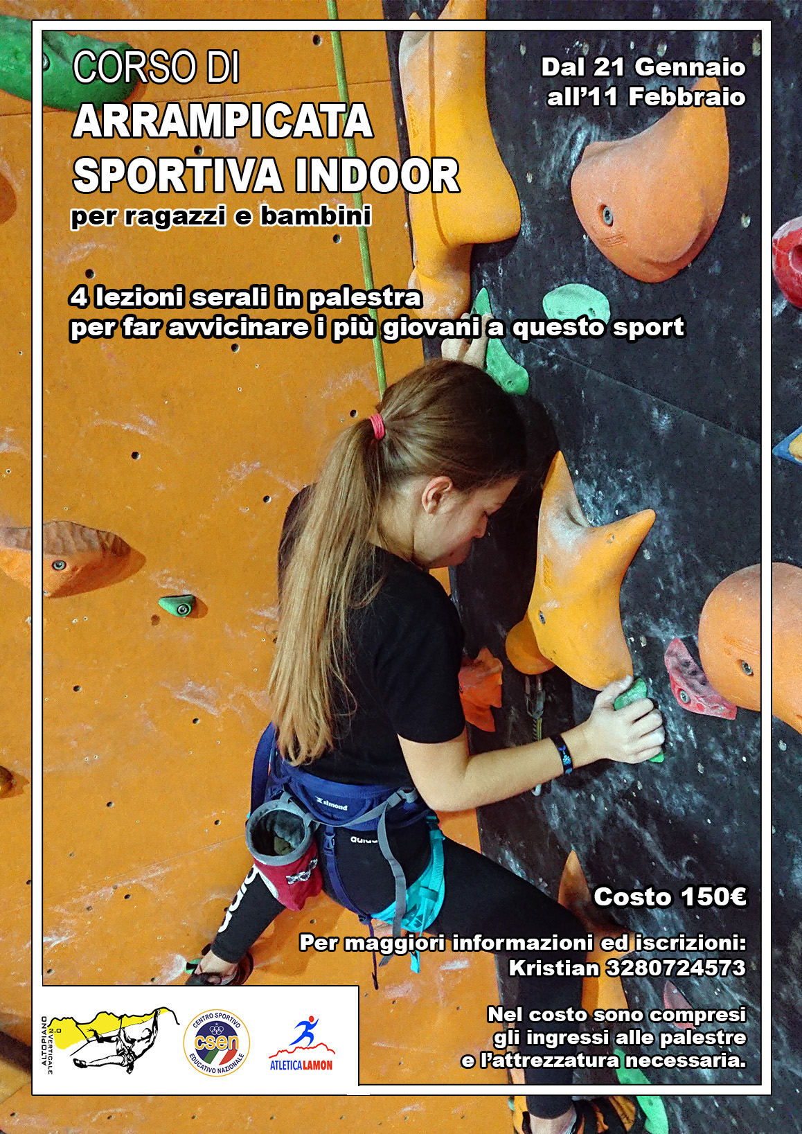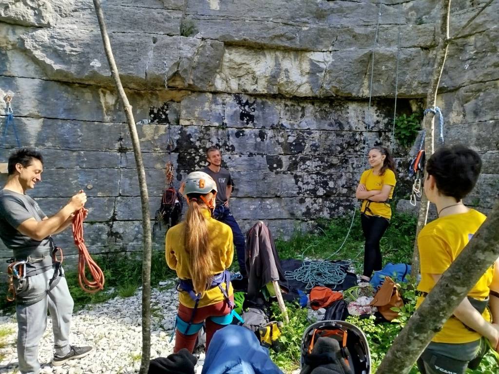 Tutti i nostri corsi includono: imbrago, scarpette, caschetto, corda, rinvii, dispositivo di bloccaggio, magnesite e porta magnesite.